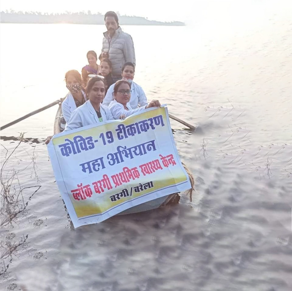 कोरोना वैक्सीनेशन महाअभियान का एक नज़ारा जबलपुर के आस-पास देखने को मिला जहां, मोबाइल वैक्सीनेशन टीम ने नाव से बरगी बांध के डूब क्षेत्र के गाँव मिडकी पहुंच कर व्यक्तियों को कोरोना का टीका लगाया। ये कार्यकर्ता लोगों की जान बचाने के लिए जमीन पर उतरे, समर्पण के साथ कार्य कर रहे कोरोना वारियर्स हैं। कार्यकर्ताओं ने ठान लिया है मध्यप्रदेश को कोरोना मुक्त बनाना है।