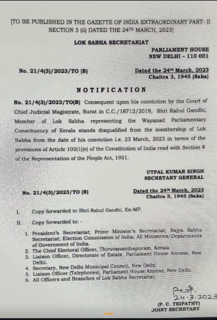 मानहानि के मामले में दो वर्ष की सजा के कारण हुई कांग्रेस नेता सांसद राहुल गांधी की लोकसभा रद्द की गई ।