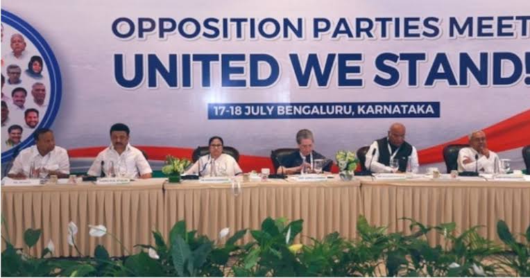 बेंगलुरू में विपक्षी दलों की बैठक में विपक्षी गठबंधन का नाम रखा गया INDIA- इंडियन नेशनल डेमोक्रेटिक इंक्लूसिव एलायंस रख लिया हैं। विपक्ष मुख्यमंत्री नीतीश कुमार के नेतृत्व में विपक्षी गठबंधन बना लिया हैं जिसका नाम UPA की जगह INDIA रख लिया हैं।