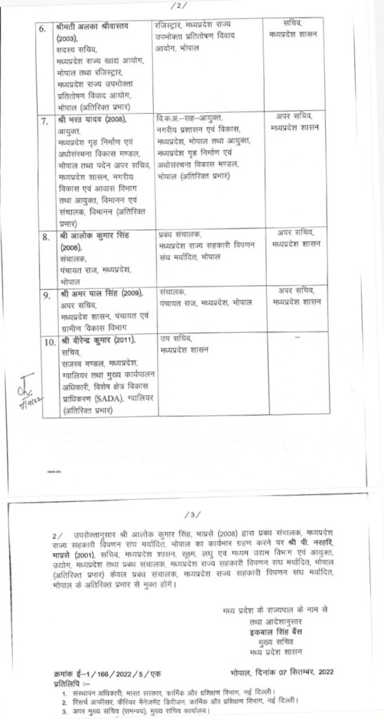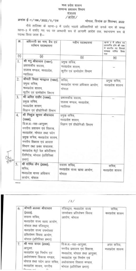 आईएएस स्मिता भारद्वाज को सचिव मानव अधिकार आयोग का जिम्मा मिला। आईएएस अमित राठौर को विज्ञान एवं प्रौद्योगिकी विभाग से राजस्व मंडल ग्वालियर, निकुंज कुमार श्रीवास्तव को प्रमुख सचिव मध्य प्रदेश विज्ञान एवं प्रौद्योगिकी विभाग बनाया गया। शोभित जैन को सचिव राज्य खाद्य आयोग, अलका श्रीवास्तव को रजिस्ट्रार उपभोक्ता प्रतितोषण विवाद आयोग, भरत यादव को आयुक्त नगरीय प्रशासन, आलोक कुमार सिंह को प्रबंध संचालक राज्य सहकारी विपणन संघ, अमरपाल सिंह को संचालक पंचायत राज और वीरेंद्र कुमार को उप सचिव मध्य प्रदेश शासन की जिम्मेदारी दी गई है।