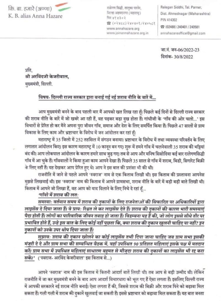 दिल्ली। दिल्ली के सीएम अरविंद केजरीवाल को मंगलवार दोपहर समाज सुधारक और भ्रष्टाचार विरोधी अन्ना हजारे ने पत्र लिखा है। अन्ना हजारे ने पत्र लिखकर दिल्ली की आबकारी नीति का विरोध किया है। अन्ना हजारे ने अरविंद केजरीवाल के सीएम बनने के बाद पहली बार पत्र लिखा है। उन्होंने पत्र में लिखा कि हमें आशा थी कि आप महाराष्ट्र की तरह आबकारी नीति बनाएंगे लेकिन आपने तो शराब के सेवन को और अधिक बढ़ावा देने वाली नीति बना दी।