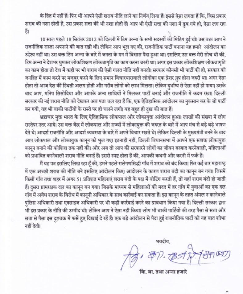 अन्ना हजारे ने पत्र में लिखा सरकार चाहे किसी भी पार्टी की हो लेकिन उसे जनहित के काम करना चाहिए। लेकिन दुर्भाग्य से अरविंद केजरीवाल की सरकार में ऐसा नहीं हो रहा। उन्होंने आरोप लगाया कि मनीष सिसोदिया और अरविंद केजरीवाल ने अपने साथियों के साथ मिलकर एक ऐतिहासिक आंदोलन को नुकसान करके पार्टी बनाई और अब गलत रास्ते पर चल रहे हैं। अरविंद केजरीवाल पर सत्ता के नशे में डूबे होने की बात कही है। साथ ही उन्होंने अरविंद केजरीवाल को 18 सितंबर 2012 को हुई टीम अन्ना की बैठक को याद दिलाते हुए कहा कि शायद आप भूल गए की राजनीतिक दल बनाना हमारे आंदोलन का इरादा नहीं था। अन्ना हजारे ने तो यहां तक लिख दिया कि अरविंद केजरीवाल आपने अपनी पुस्तक स्वराज में बड़ी-बड़ी बातें लिखी, उसकी प्रस्तावना आपने मुझसे लिखवाई थी लेकिन उसमें अमल नहीं किया।