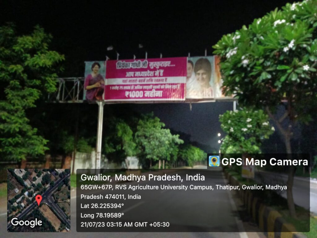 ऐसे एक नहीं अनेकों पोस्टर ग्वालियर के चौराहों पर बने होर्डिंग्स में लगाये गए हैं, जिनमें शिवराज सरकार के कामों को, उपलब्धियों को विशेष रूप से दिखाया गया है। अन्य पोस्टर्स की बात करें तो सभी पोस्टर्स में हुक लाइन एक सी है- प्रियंका गांधी जी मुस्कुराइए , आप मध्यप्रदेश में हैं; लेकिन उसके बाद की बात अलग है। एक जगह लिखा लाड़ली बहना को 1000 रुपए हर महीने मिल रहे हैं, किसानों को कर्जमाफी का झांसा नहीं, ऋण ब्याज माफी का पैसा सरकार दे रही है, प्रदेश में सबसे ज्यादा गरीबी घटी है, विकास दर 19.76% है, बेरोजगारी भत्ता का झांसा नहीं बल्कि सीखो कमाओ योजना है, बिटिया बोझ नहीं देवियां है, लाड़ली लक्ष्मी योजना से बेटियां लखपति पैदा हो रही हैं, बुजुर्ग अब हवाई यात्रा से तीर्थदर्शन कर रहे है और योजनाएं बंद नहीं बल्कि बेहतर हो रही हैं।