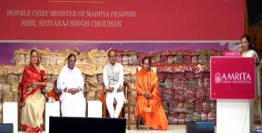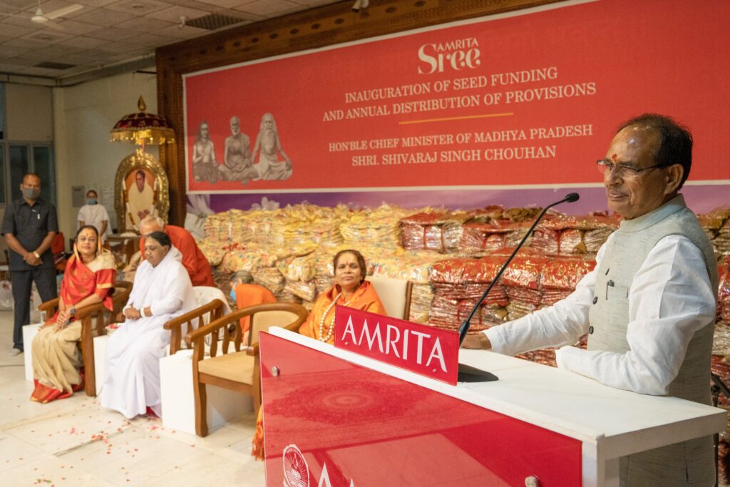 कार्यक्रम में सीएम शिवराज ने अपने संबोधन में कहा सारे शास्त्रों का एक ही सार है आप हर इंसान में परमात्मा का दर्शन कर सकते हैं, तुलसीदास जी ने कहा है कि सिया राम मय सब जग जानी यानी कि भगवान की पूजा अगर करना है तो गरीबों की सेवा कर लो। हिमालय पर बैठकर भगवान के लिए तपस्या कर लोगे, मंदिर में आरती गाओगे तो मैं नहीं जानता कि भगवान मिलेंगे कि नहीं मिलेंगे लेकिन अगर गरीबों की सेवा कर ली तो उनकी आंखों में साक्षात भगवान दिखाई देंगे। विधवाओं की सेवा के लिए अम्मा के हाथ आगे बढ़े हैं यह अद्भुत है। साथ ही उन्होंने यह भी कहा कि मैं अम्मा के प्रेम के संदेश को मध्य प्रदेश में बांटने का प्रयास करूंगा, सभी की इच्छा है और मेरी भी इच्छा है कि आप मध्यप्रदेश आओ और करुणा दया और प्रेम का सागर बहाओ। जो लोग विशाल हृदय के होते हैं उनके लिए सारी दुनिया ही एक परिवार है। उन्होंने मां अमृतानंदमयी से आशीर्वाद मांगा कि हमें सन्मार्ग पर चलने का साहस दें।