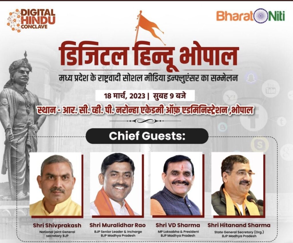 राजधानी में आज राष्ट्रवादी सोशल मीडिया इंफ्ल्यूएंसर और नेता जमा होंगे। भोपाल में आज डिजिटल हिंदू कॉनक्लेव का आयोजन होगा। बीजेपी प्रदेश अध्यक्ष वीडी शर्मा, राष्ट्रीय सह संगठन महामंत्री शिव प्रकाश और प्रदेश प्रभारी मुरलीधर राव भी स्पीकर के रूप में शामिल होंगे। संगठन महामंत्री हितानंद शर्मा भी मौजूद रहेंगे। हिंदुत्व और राष्ट्रहित के विभिन्न विषयों पर चर्चा होगी। राष्ट्रवादी ताक़तों का एकीकरण राष्ट्रीय विचार का सशक्तिकरण, राष्ट्रीय पुर्नवैभव का जागरण जैसे विषयों को लेकर चर्चा होगी। राष्ट्रवाद को लेकर कई दिग्गज मंथन करेंगे। भोजशाला और कई अन्य विषयों पर भी चर्चा होगी। प्रशासन अकादमी में कार्यक्रम होगा।