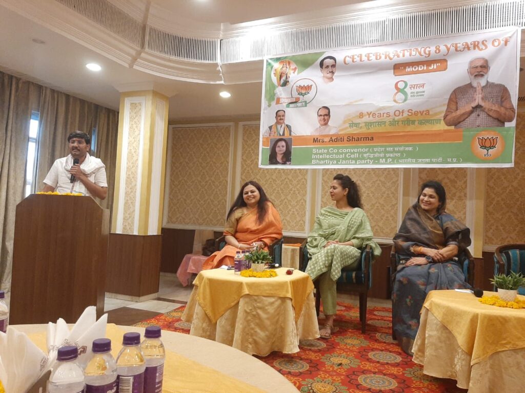 भोपाल। प्रधानमंत्री नरेंद्र मोदी जी की सरकार के 8 वर्ष पूर्ण होने पर भाजपा बुद्धिजीवी प्रकोष्ठ द्वारा शनिवार को होटल आमेर पैलेस में प्रबुद्ध महिला संगोष्ठी आयोजित की गई। इसमें भोपाल संभाग की प्रबुद्ध महिलाओं ने भाग लिया। विधायक श्रीमती कृष्णा गौर ने संगोष्ठी को संबोधित करते हुए कहा कि पिछले 8 वर्षों में भारत विश्व पटल पर अग्रणी बना है। इन 8 सालों में गांव, गरीब और किसानों सहित समाज के हर वर्ग की चिंता मोदी सरकार ने की है। गरीबों को उज्जवला योजना के अंतर्गत एलपीजी सिलेंडर, जनधन खाता जैसी अनेकों सुविधाएं प्रधानमंत्री श्री नरेन्द्र मोदी ने उपलब्ध करायी हैं। प्रधानमंत्री जी ने बीते सालों में प्रधानमंत्री आवास योजना के जरिए गरीबों का जीवन बदलने का काम किया है, तो आजादी के बाद पहली बार आयुष्मान भारत योजना के माध्यम से 5 लाख तक का उपचार मुफ्त कराकर करोड़ों जिंदगियों को बचाने का काम किया है।