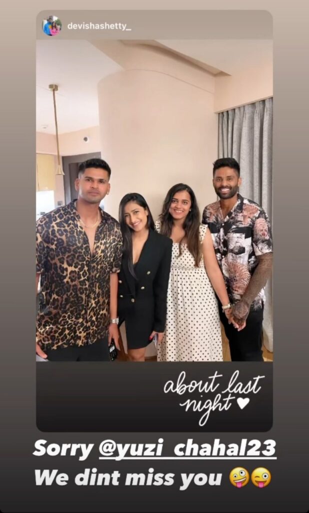 कुछ दिनों पहले भारतीय क्रिकेटर सूर्यकुमार यादव ने अपनी पत्नी के साथ ही श्रेयस अय्यर और धनश्री वर्मा के साथ अपनी फ़ोटो के ज़रिए युज़वेन्द्र चहल को ट्रोल किया था।