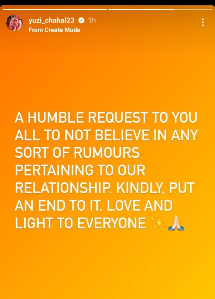 हालांकि युज़वेन्द्र चहल ने इंस्टाग्राम पर एक स्टोरी पोस्ट कर तलाक की खबरों पर पूर्ण विराम लगा दिया है। उन्होंने अपने तलाक की खबरों को लेकर यह लिखा है –