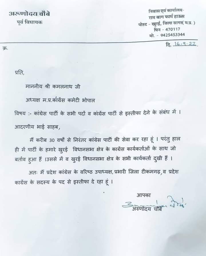 खुरई से पूर्व विधायक अरुणोदय चौबे ने कमलनाथ को भेजे अपने इस्तीफे में लिखा है कि मैं करीब 30 वर्षों से निरंतर कांग्रेस पार्टी की सेवा कर रहा हूं परंतु हाल ही में खुरई विधानसभा क्षेत्र में कांग्रेस कार्यकर्ता के साथ जो बर्ताव हुआ उससे बहुत दुख हुआ। इसलिए मैं कांग्रेस कार्यकर्ताओं के साथ हुए बुरे बर्ताव से आहत होकर अपने सभी पदों से इस्तीफा दे रहा हूं। ज्ञात हो कि सागर में वर्ष 2008 में हुए विधानसभा चुनाव में अरुणोदय चौबे ने बीजेपी प्रत्याशी को मात दी थी। हाल ही में पृथ्वीपुर विधानसभा सीट पर हुए उपचुनाव में भी ब्राह्मण वोट बैंक को साधने की जिम्मेदारी कांग्रेस ने अरुणोदय चौबे को सौंपी थी।