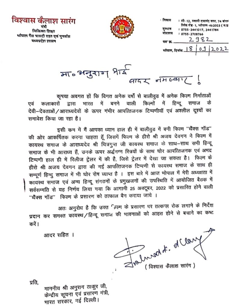 भोपाल। मध्य प्रदेश सरकार के मंत्री विश्वास सारंग ने केंद्रीय मंत्री अनुराग ठाकुर को पत्र लिखा है। मंत्री विश्वास सारंग ने 25 अक्टूबर को रिलीज होने जा रहे फिल्म “थैंक्स गॉड” पर कायस्थ समाज की भावनाओं को आहत करने का आरोप लगाया है। साथ ही यह भी कहा कि विगत दिनों से फिल्म निर्माताओं द्वारा हिंदू देवी-देवताओं को लेकर आपत्तिजनक टिप्पणी एवं दृश्य फिल्माए जा रहे हैं।