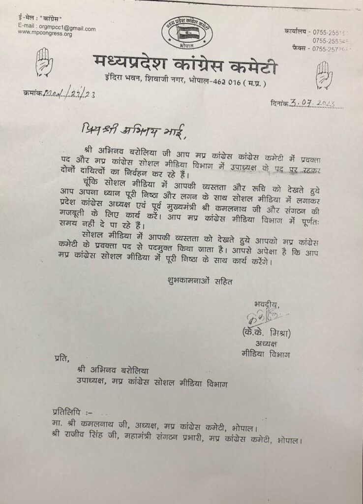 मप्र कांग्रेस के प्रवक्ता को हटाया! पत्र वायरल होते ही खेमेबाजी शुरू हुई