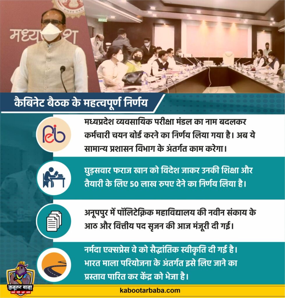 मध्यप्रदेश के मुख्यमंत्री शिवराज सिंह चौहान की अध्यक्षता में कैबिनेट की बैठक हुई। बता दें कि इस बार मध्यप्रदेश के शिवराज सिंह चौहान कोरोना से पीड़ित हो गए हैं, इसलिए सीएम शिवराज वर्चुअली मीटिंग ले रहे है। कैबिनेट बैठक में महत्तवपूर्ण निर्णय लिए गए।