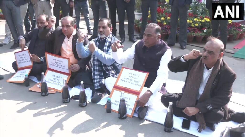 भाजपा विधायकों ने विधानसभा के बाहर आम आदमी पार्टी की सरकार के खिलाफ यमुना के पानी को लेकर विरोध प्रदर्शन किया।