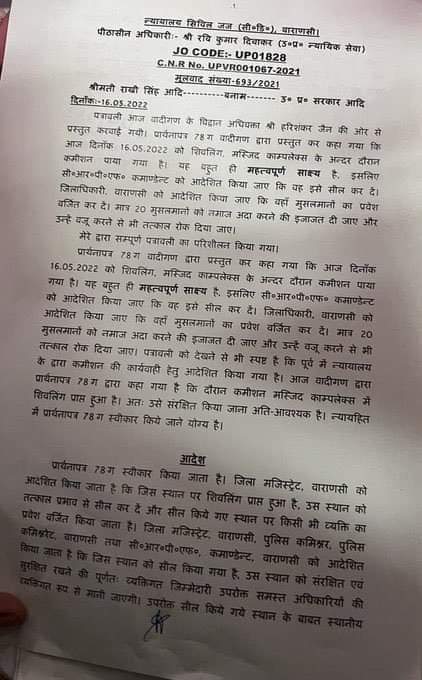 बता दें, सोहनलाल ने मीडिया से चर्चा में कहा कि, मस्जिद परिसर में शिवलिंग मिला है। वहां शिवलिंग मिलते ही हर हर महादेव के नारे लगने लगे। लोग खुशी से नाचने लगे। वहीं, सर्वे टीम के सदस्य आर पी सिंह को बाहर रोक लिया गया। बताया जा रहा है कि आर पी सिंह पर सर्वे से जुड़ी सूचनाएं लीक करने का आरोप लगा है।