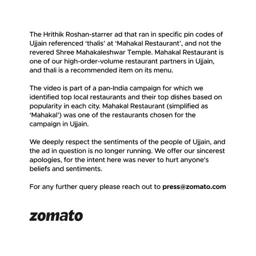 जोमैटो कंपनी ने सोशल मीडिया पर एक लेटर जारी कर कहा कि वह ऐड देश भर में चल रहे कैंपेन का हिस्सा था। उस ऐड में ऋतिक रोशन लोकल फूड आउटलेट्स को प्रमोट कर रहे थे। जोमैटो का तर्क है कि ऐड के दौरान ऋतिक रोशन ने महाकाल से थाली मंगवाने की बात की थी उसका मतलब था कि शहर के प्रसिद्ध महाकाल रेस्टोरेंट से थाली मंगवाई है। जोमैटो कंपनी ने उज्जैन वासियों की भावनाओं का सम्मान करते हुए अपने उस ऐड को वापस ले लिया है।