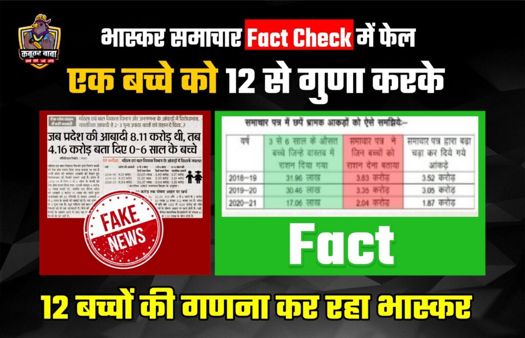 शुक्रवार को दैनिक भास्कर के भोपाल संस्करण में “जब प्रदेश की आबादी 8.11 करोड़ थी, तब 4.6 करोड बता दिए 0-6 साल के बच्चे” शीर्षक से खबर प्रकाशित की गई। खबर लिखने वाले ने महिला एवं बाल विकास और जनगणना के आंकड़ों में विरोधाभास होने और वास्तविक आंकड़ों से 2 से 3 गुना अधिक बच्चों को राशन देने की बात कही। साथ ही यह भी लिखा कि वर्ष 2018-19 में 0 से 6 साल के बच्चों की संख्या महिला एवं बाल विकास विभाग द्वारा 4 करोड़ 16 लाख बताई गई जबकि उस दौरान 8 करोड़ 11 लाख आबादी थी। इस भ्रामक खबर के द्वारा दैनिक भास्कर समूह ने पोषण आहार में करोड़ों रुपए के घोटाले की बात कही, जबकि वास्तविकता इस आंकडे से परे है।