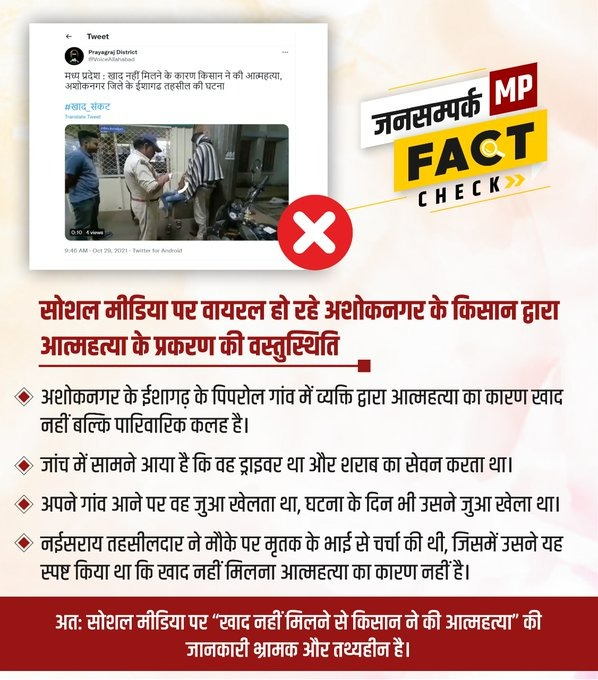 जानिये इस वायरल खबर का सच! खाद नही मिलने के कारण किसान ने की आत्महत्या