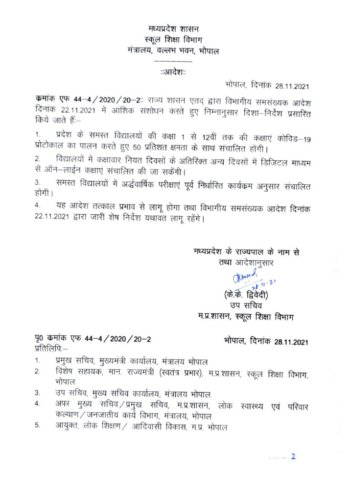 स्कूल शिक्षा मंत्री इंदर सिंह परमार ने कहा कि सीएम के निर्देश के बाद 1 फरवरी से स्कूल खुल जाएंगे। एमपी बोर्ड की परीक्षाओं का टाइम टेबल पहले ही जारी कर दिया गया है। उसे हम ऑफलाइन मोड में समय पर कराने के प्रयास में है। अगर कोई व्यवधान आता है, तो फिर आगे का निर्णय लिया जाएगा। फिलहाल हम समय पर एग्जाम कराएंगे। 10वीं की परीक्षाएं 18 फरवरी से शुरू होकर 10 मार्च तक और 12वीं की परीक्षाएं 17 फरवरी से शुरू होकर 12 मार्च तक चलेगी।