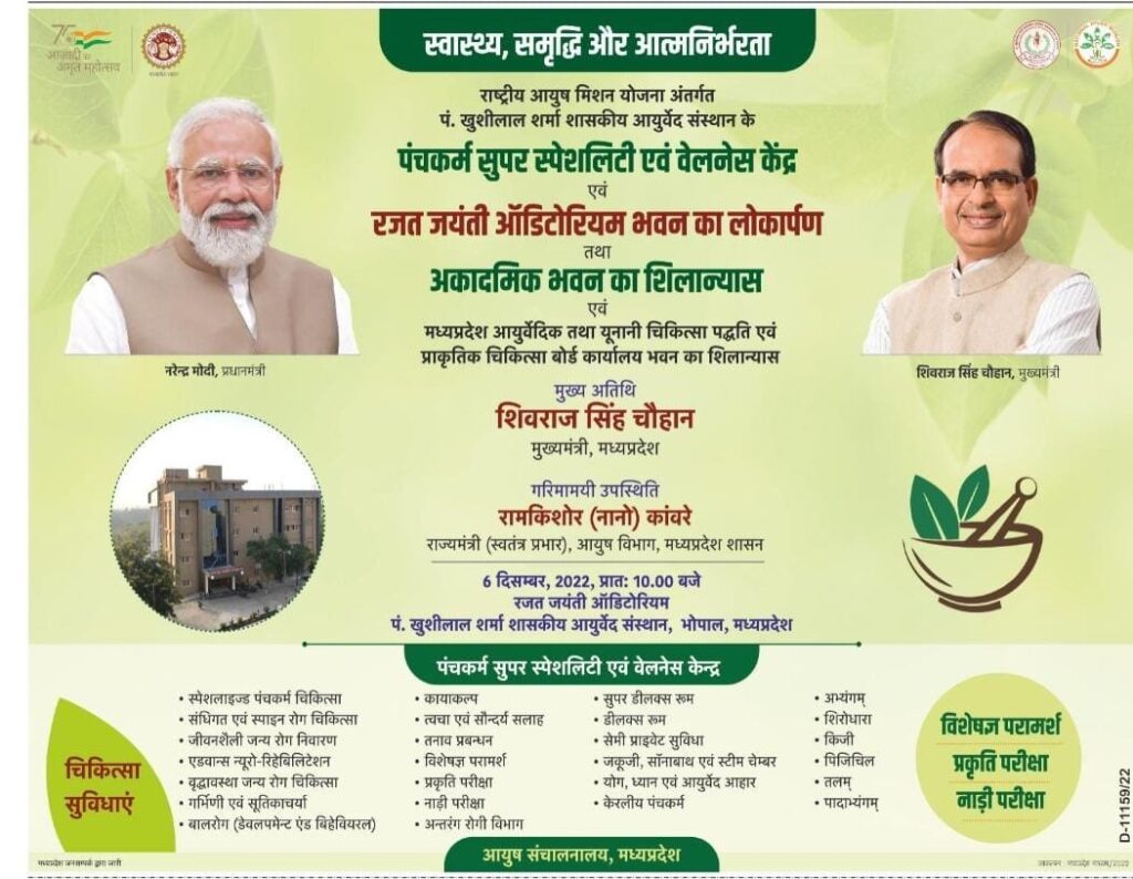 पं. खुशीलाल शर्मा आयुर्वेदिक कॉलेज में 10 करोड़ रुपए की लागत से ढाई साल में यह सेंटर बनकर तैयार। अभी आयुर्वेदिक कॉलेज में 150 बेड की पंचकर्म यूनिट संचालित। डेली करीब 200 मरीज अभी पंचकर्म कराते हैं। पंचकर्म के प्रति लोगों की बढ़ती रूचि और मरीजों की बढ़ती संख्या को देखते हुए हाईटेक यूनिट तैयार की गई। कार्यक्रम में आयुष मंत्री रामकिशोर कावरे,भोपाल सांसद प्रज्ञा ठाकुर, विधायक पीसी शर्मा उपस्थित थे।