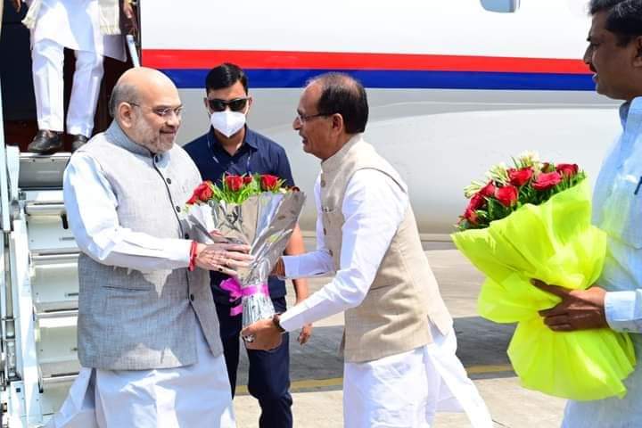 केंद्रीय गृहमंत्री अमित शाह मध्यप्रदेश की राजधानी भोपाल पहुंचे जहां राजा भोज एयरपोर्ट पर मध्यप्रदेश के मुख्यमंत्री शिवराज सिंह चौहान ने उनका स्वागत किया है।