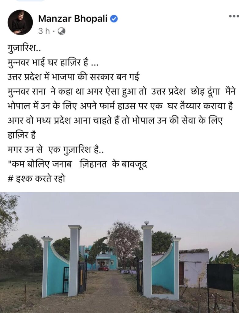 मंजर भोपाली ने लिखा कि गुज़ारिश..मुन्नवर भाई घर हाज़िर है …उत्तर प्रदेश में भाजपा की सरकार बन गईमुन्नवर राना ने कहा था अगर ऐसा हुआ तो उत्तर प्रदेश छोड़ दूंगा मैने भोपाल में उन के लिए अपने फार्म हाउस पर एक घर तैय्यार कराया है अगर वो मध्य प्रदेश आना चाहते हैं तो भोपाल उन की सेवा के लिए हाज़िर है मगर उन से एक गुज़ारिश है..”कम बोलिए जनाब ज़िहानत के बावजूद # इश्क करते रहो।