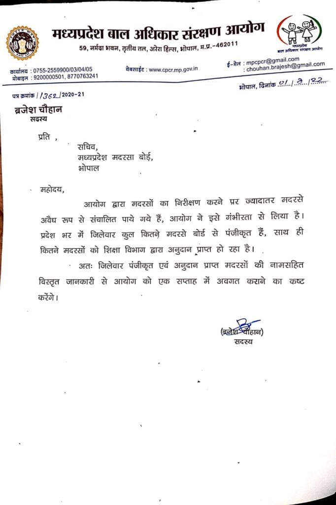 मध्य प्रदेश बाल अधिकार संरक्षण आयोग के सदस्य बृजेश चौहान ने सचिव मध्य प्रदेश मदरसा बोर्ड को एक पत्र लिखा है। उन्होंने पत्र में लिखा कि बाल अधिकार संरक्षण आयोग द्वारा मदरसों का निरीक्षण करने पर पाया गया कि ज्यादातर मदरसे अवैध रूप से संचालित हो रहे हैं। उन्होंने जानकारी मांगी है कि प्रदेश भर में जिलेवार कितने मदरसे बोर्ड में पंजीकृत हैं। साथ ही उन्होंने यह भी पूछा है कि कितने मदरसों को शिक्षा विभाग द्वारा अनुदान दिया जा रहा है। मध्य प्रदेश बाल अधिकार संरक्षण आयोग ने यह पूरी जानकारी मध्य प्रदेश मदरसा बोर्ड भोपाल के सचिव से 1 सप्ताह में उपलब्ध करवाने को कहा है।