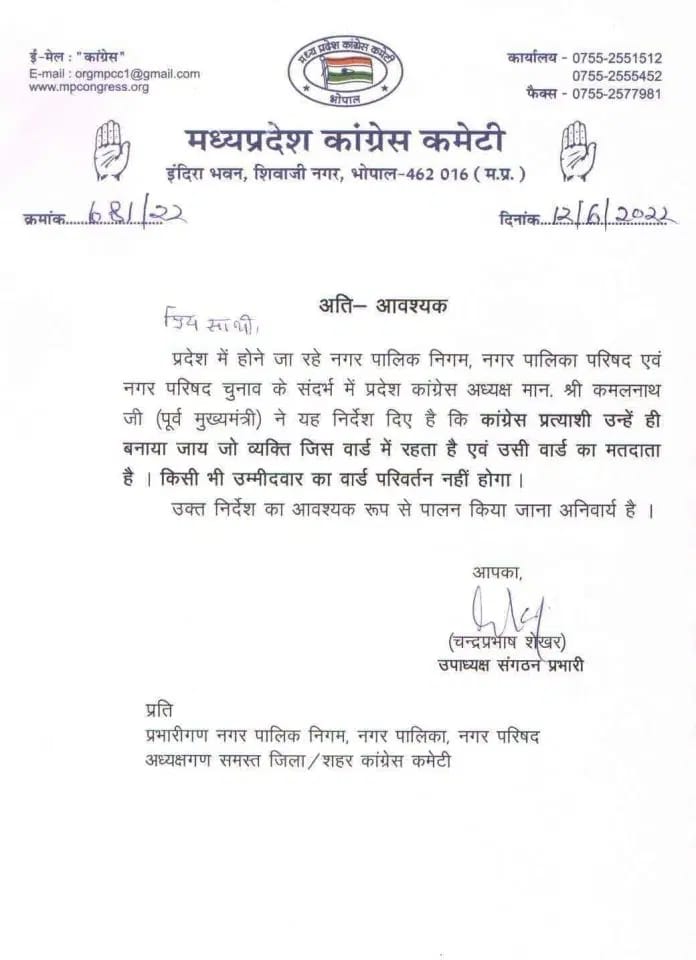 लेकिन इस बार कांग्रेस के प्रदेश अध्यक्ष कमलनाथ ने निर्णय लिया है कि कांग्रेस उन्हें ही प्रत्याशी बनाएगी जो व्यक्ति जिस वार्ड में रहता है और उसी वार्ड का मतदाता है। किसी भी उम्मीदवार का वार्ड परिवर्तित नहीं होगा। सभी नगर पालिका निगम, नगर पालिका परिषद के प्रभारी गण और अध्यक्ष सहित सभी शहर जिला कांग्रेस कमेटियों को इस बात के स्पष्ट निर्देश दिए गए हैं।
