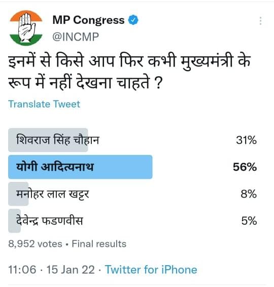 एमपी कांग्रेस सोशल मीडिया पर आए दिन कोई ना कोई सर्वे करती रहती है। लेकिन कुछ दिन पहले किया हुआ ट्वीट अब कांग्रेस को ही भारी पड़ गया है। और बात इतनी बढ़ गई कि उन्हें ट्वीट डिलीट करके भागना पड़ा। दरअसल, एमपी कांग्रेस ने अपने ट्विटर हैंडल से एक सर्वे किया था जिसमें उसने पूछा कि- इनमें से किसे आप फिर कभी मुख्यमंत्री के रूप में नहीं देखना चाहते?फिर कभी मुख्यमंत्री के रूप में नहीं देखना चाहते?