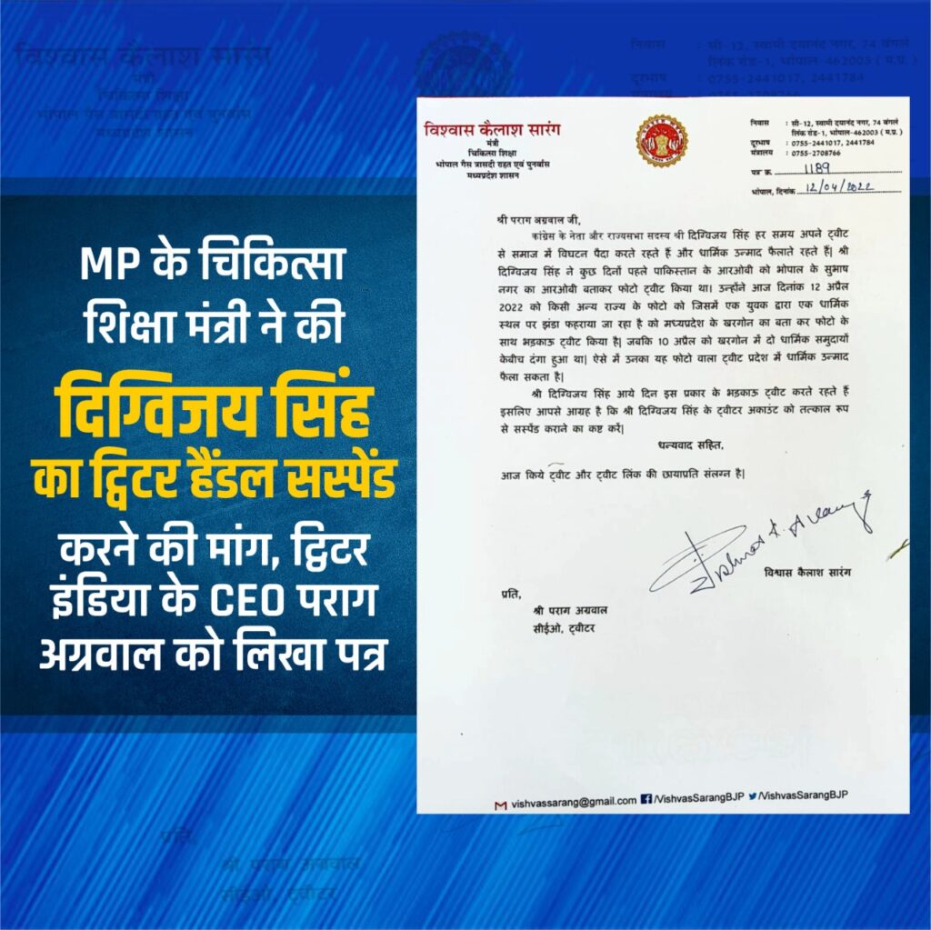 वहीं अब विश्वास सारंग ने एक पत्र लिखा है जिसमें उन्होंने ट्विटर इंडिया के सीईओ पराग अग्रवाल से दिग्विजय सिंह के ट्विटर हैंडल को परमानेंट सस्पेंड करने की मांग की है। लेटर में लिखा है कि “कांग्रेस के नेता और राज्यसभा सदस्य श्री दिग्विजय सिंह हर समय अपने ट्वीट से समाज में विघटन पैदा करते रहते हैं और धार्मिक उन्माद फैलाते रहते हैं। श्री दिग्विजय सिंह ने कुछ दिनों पहले पाकिस्तान के आरओबी को भोपाल के सुभाष नगर का आरओबी बताकर फोटो ट्वीट किया था। उन्होंने आज दिनांक 12 अप्रैल 2022 को किसी अन्य राज्य के फोटो को जिसमें एक युवक द्वारा एक धार्मिक स्थल पर झंडा फहराया जा रहा है को मध्यप्रदेश के खरगोन का बता कर फोटो के साथ भड़काऊ ट्वीट किया है। जबकि 10 अप्रैल को खरगोन में दो धार्मिक समुदायों केबीच दंगा हुआ था| ऐसे में उनका यह फोटो वाला ट्वीट प्रदेश में धार्मिक उन्माद फैला सकता है। श्री दिग्विजय सिंह आये दिन इस प्रकार के भड़काऊ ट्वीट करते रहते हैं इसलिए आपसे आग्रह है कि श्री दिग्विजय सिंह के ट्वीटर अकाउंट को तत्काल रूप से सस्पेंड कराने का कष्ट करें।”