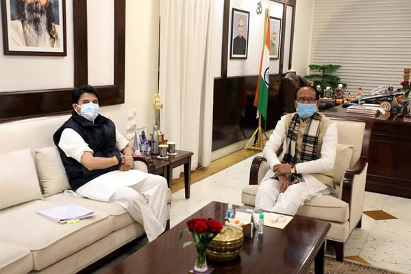 मुख्यमंत्री श्री चौहान से केन्द्रीय मंत्री श्री सिंधिया ने की सौजन्य भेंट