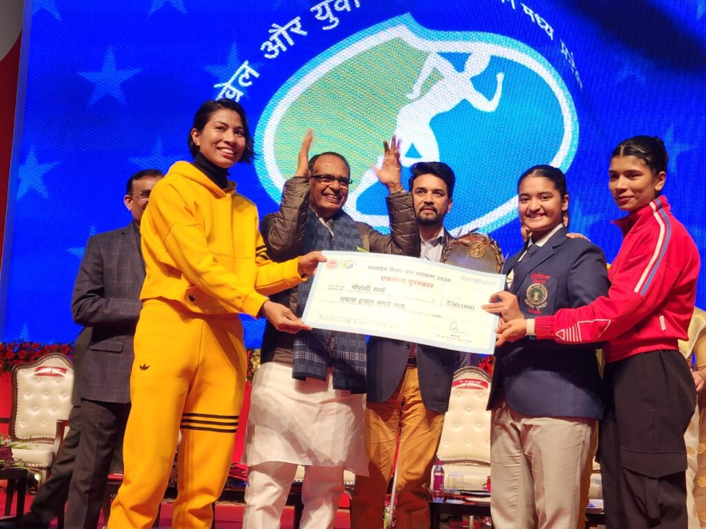 भोपाल। राजधानी में आयोजित मध्यप्रदेश शिखर खेल अलंकरण समारोह 2020 एवं खेलोंइंडिया यूथ गेम्स 2022 के प्रतीक चिन्ह के अनावरण कार्यक्रम के अवसर पर मुख्यमंत्री शिवराज सिंह चौहान ने प्रदेश के खिलाडियों के लिए कई महत्व्पूर्ण घोषणाएं की । इस मौके पर खेल एवं सूचना व प्रसारण मंत्री अनुराग ठाकुर, मध्यप्रदेश की खेल मंत्री यशोधरा राजे सिंधिया भी शामिल हुए,