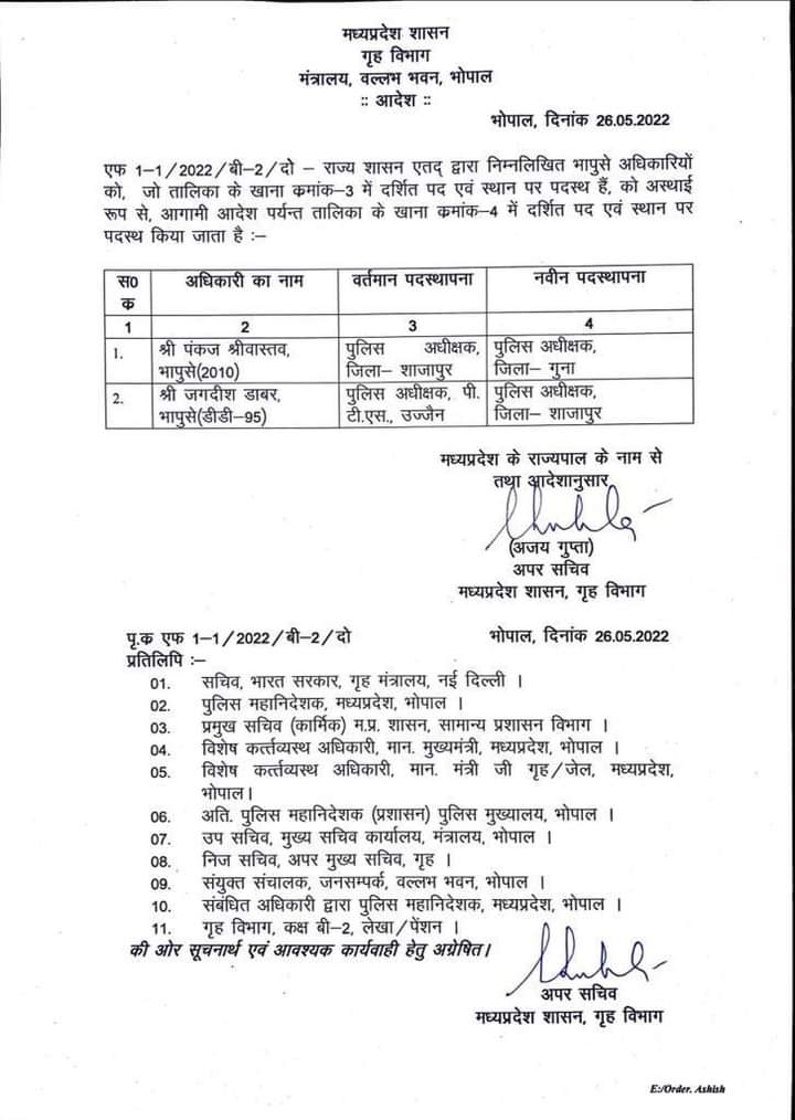 मुख्यमंत्री ने बड़ा एक्शन लेते हुए कार्य में लापरवाही के चलते शाजापुर पुलिस अधीक्षक को बदलाल आदेश जारी